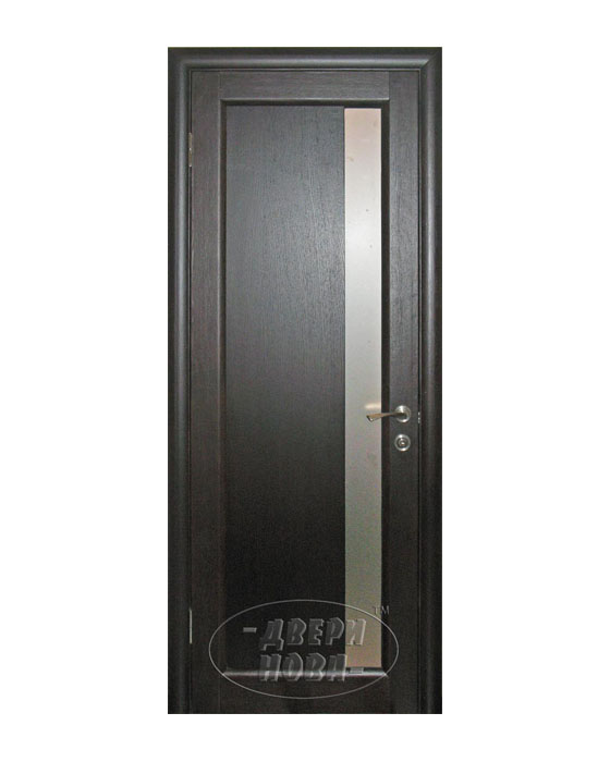 У двері присутні одна вертикальна фільонка і одна вставка з матового скла, в формі вертикальної смуги шириною 1/4 порожнини двері. Вставка розташована на стороні ближній до ручки.